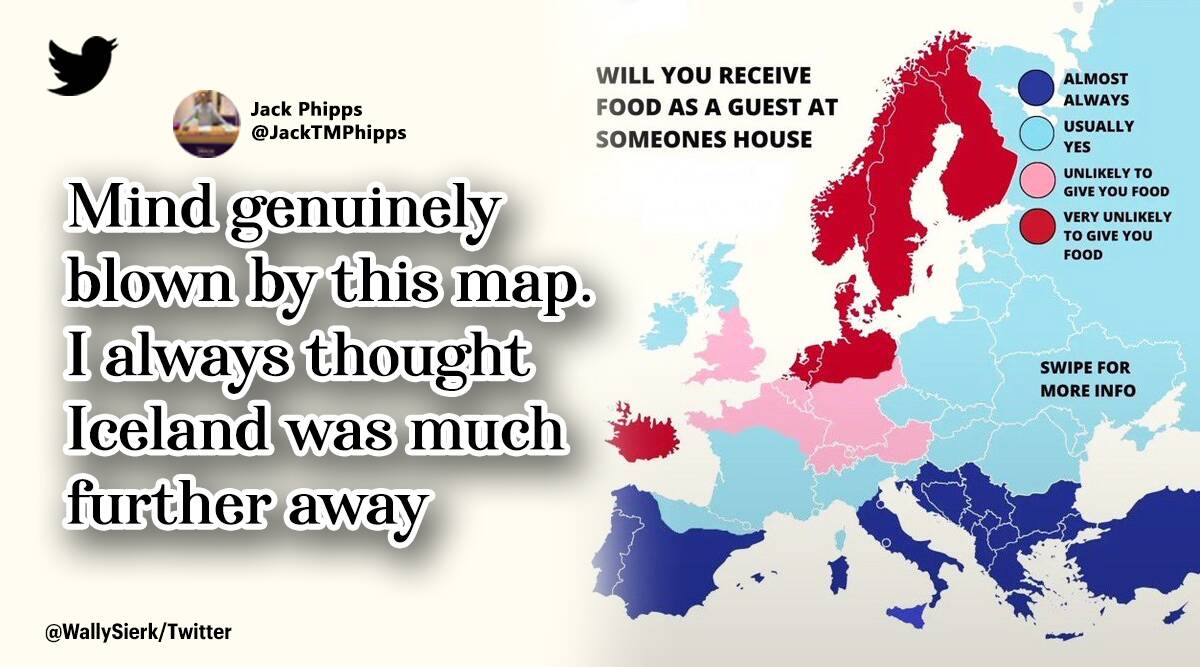 A Twitter user, who goes by the handle @WallySierk, shared a portion of a map of Europe that loosely marked counties based on “Will you receive food as a guest at someone’s house”. The categories were “Very unlikely to give you food”, “Unlikely to give you food”, “Usually yes”, and “Almost always”.